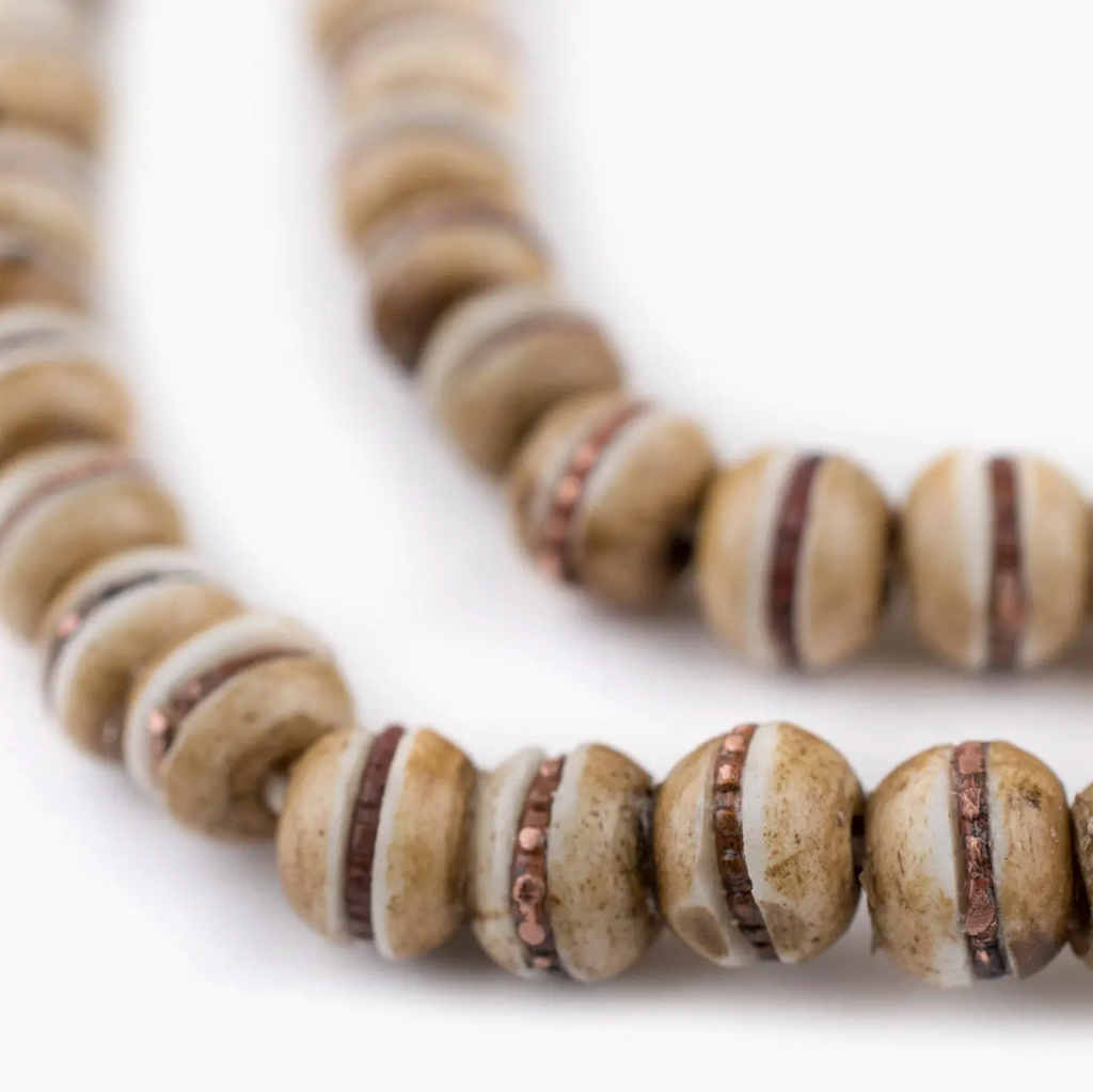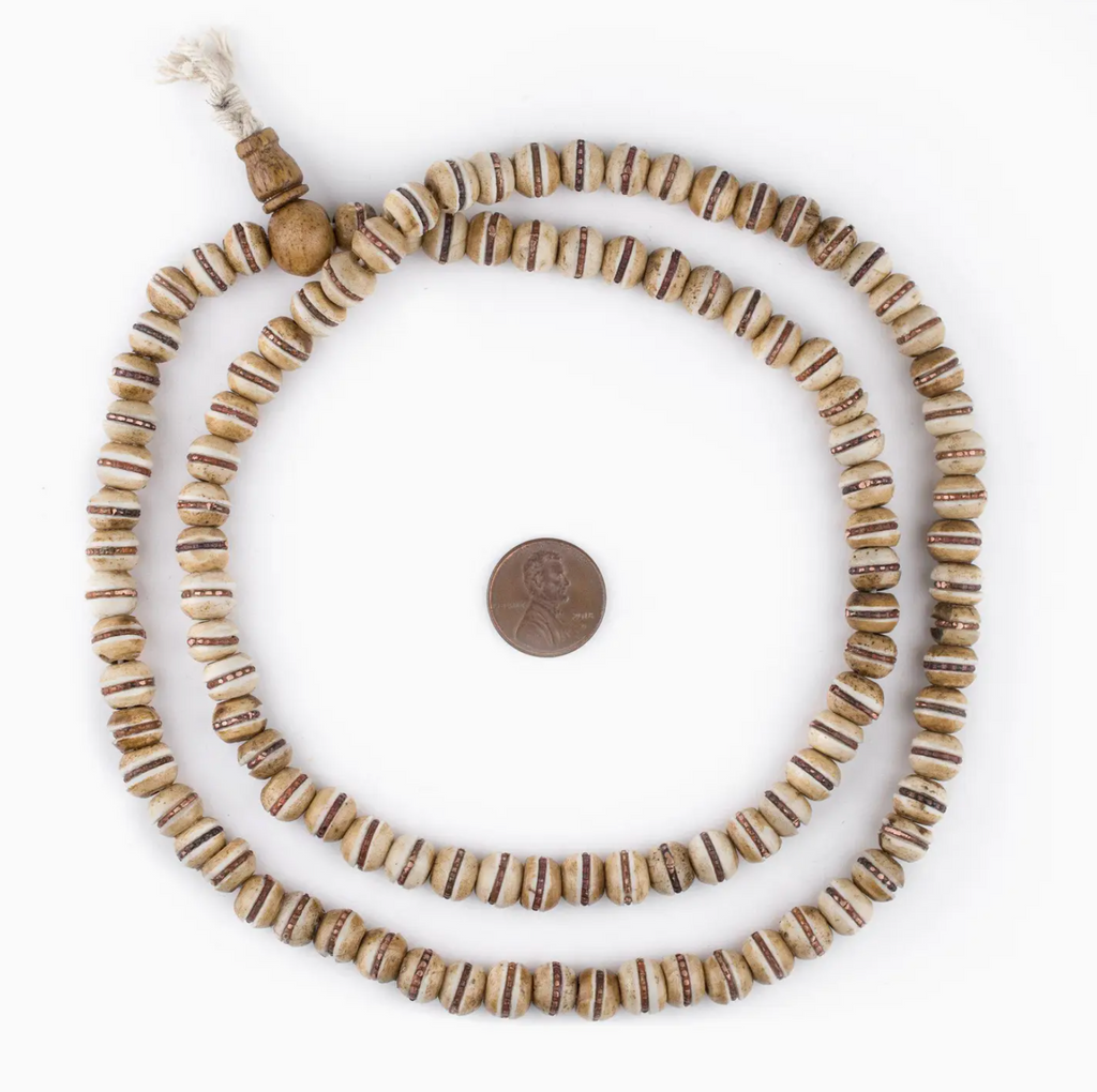 Check out this stunning strand of handmade prayer beads, crafted from bone and inlaid with copper, strung as a 108-bead mala. The full strand measures approximately 29" in length, with each bead measuring around 7 x 8mm and a hole size of about 2mm. A perfect addition to your collection of unique and meaningful beads!