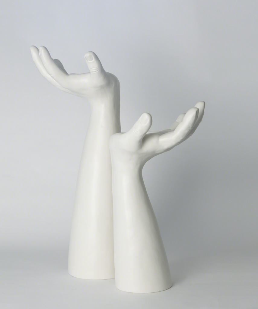 Artfully sculpted expressive hands are realized in fine Portuguese ceramic. Each hand can hold a 4-inch pillar candle or the accompanying bowl. Each hand is sold individually.