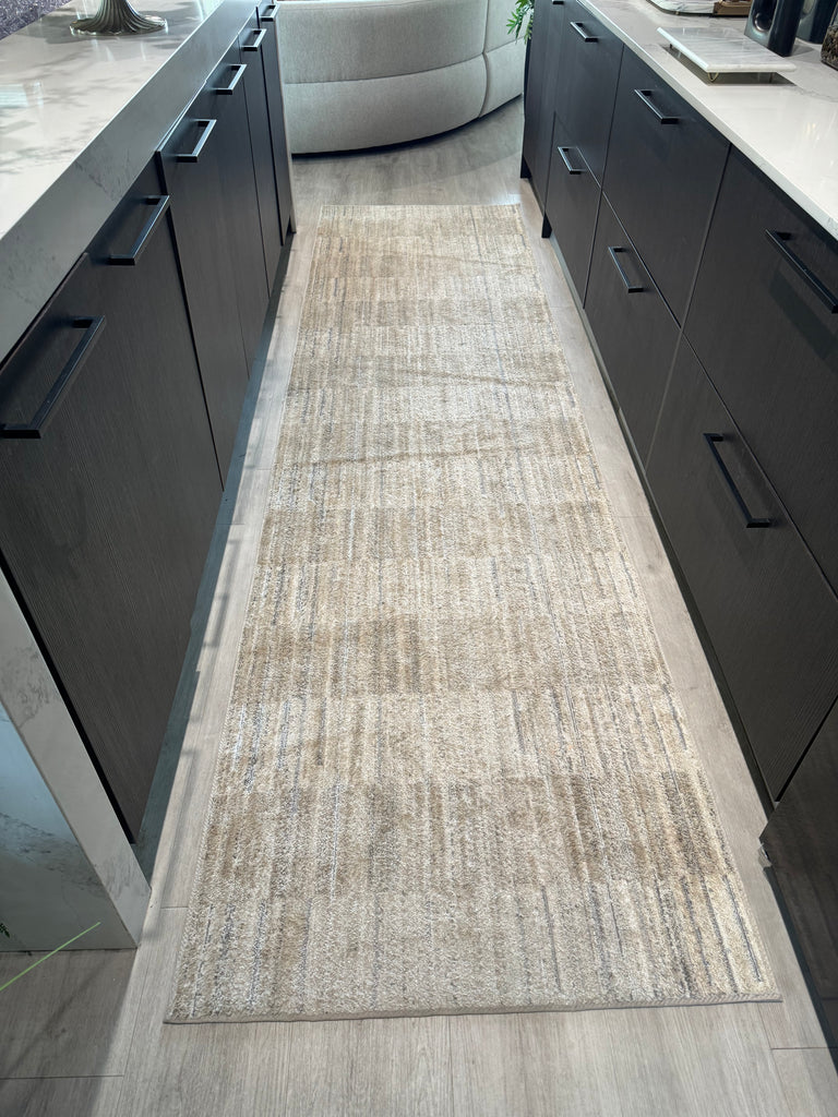 The wide, heathered stripes of the Arden Collection give this neutral area rug an elevated look and feel. It is power-loomed with yarns that are intently shrunk, like one would find in pre-shrunk clothing, at different levels to create a subtle ribbing effect. Made of polyester and polypropylene in Egypt.