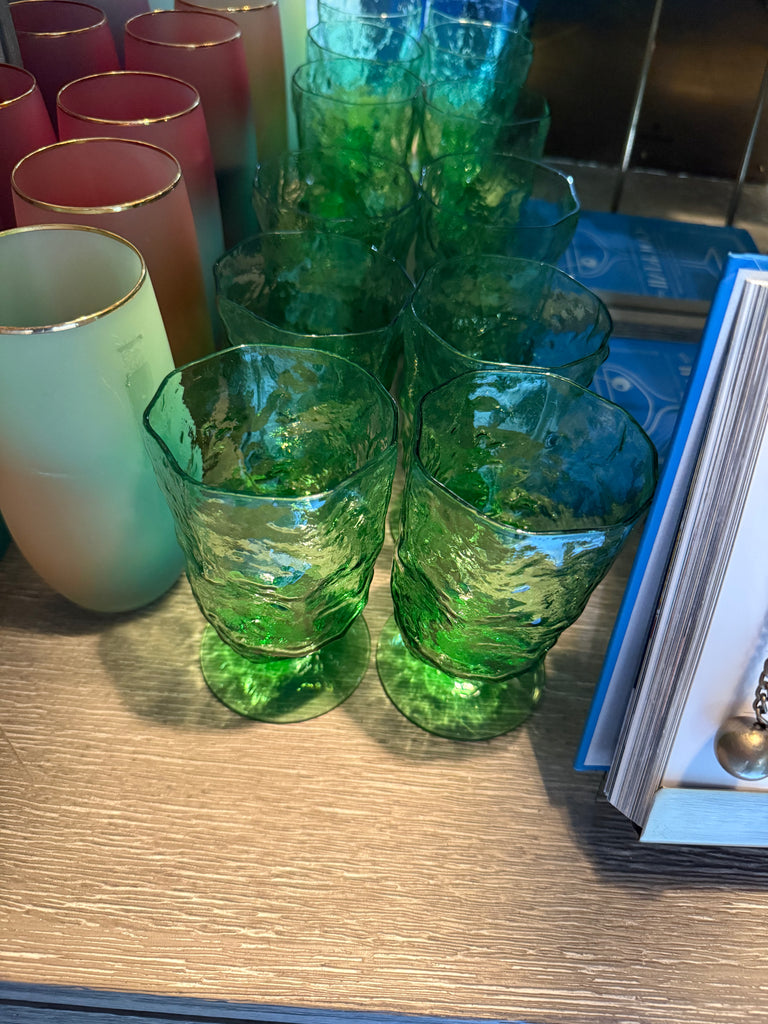 The green glassware appears to be a set of six identical glasses with a distinctive shape and color. The glasses have a wide mouth and a narrow base, giving them a classic and elegant appearance. The green color is a muted, earthy tone that adds a touch of sophistication to the overall design. The glasses seem to be made of a thick, high-quality glass that will withstand regular use. They are likely suitable for serving beverages such as juice, water, or cocktails.