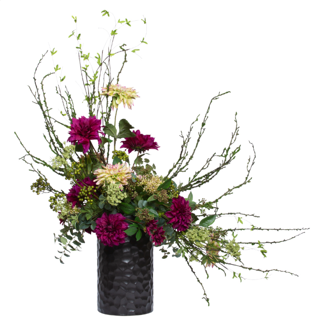DAHLIA SEDUM AND GREENERY IN LARGE BLACK VASE
