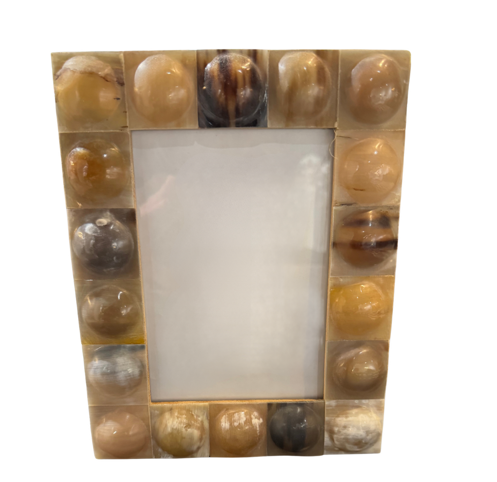 This elegant photo frame is crafted from hand-polished natural horn, each piece revealing warm striations of honey, ivory, and charcoal. The domed mosaic border creates a sculptural, organic texture that brings depth and character to any space. A striking blend of natural artistry and modern design, this frame beautifully highlights your cherished memories while adding a touch of earthy sophistication to a console, bookshelf, or nightstand.
