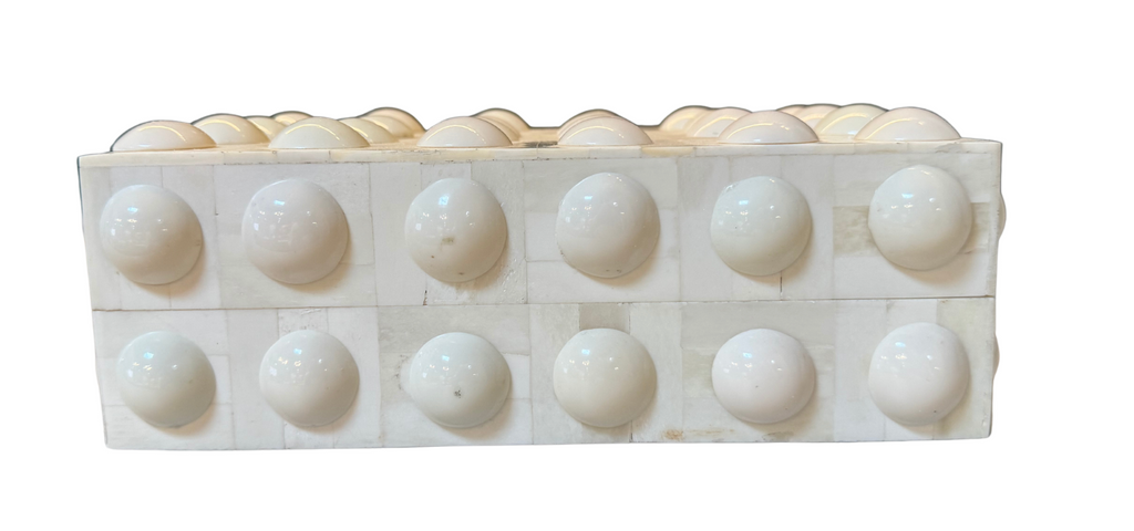 This is a rectangular decorative box with a substantial, sculptural presence. It appears to be clad in light stone or faux-stone tiles in soft white and ivory tones, arranged in a grid pattern. The surface is embellished with evenly spaced, raised dome-shaped accents that wrap continuously around the sides and across the lid, creating a tactile, three-dimensional effect.